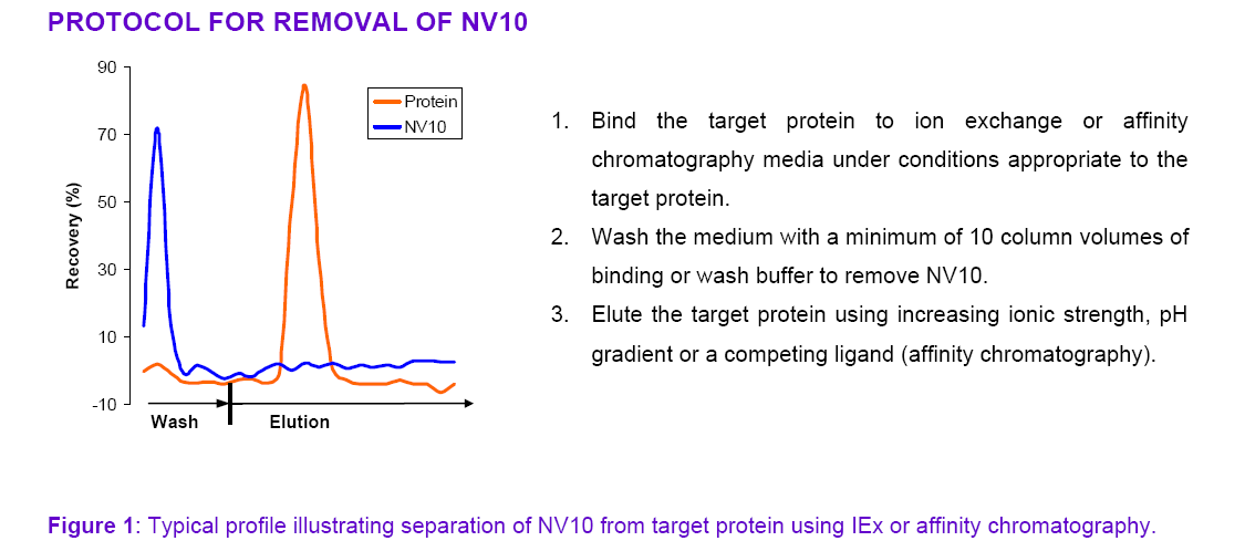 protein to ion-exchange or affinity media and washing out NV10 before elution of