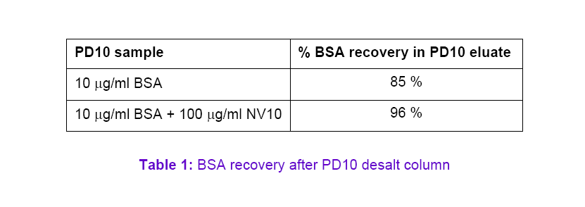 5. Continue with PD10 desalting of protein + NV10 solution as